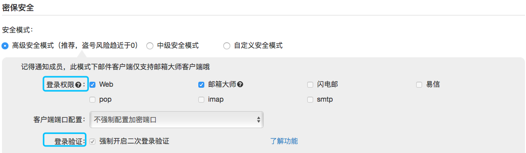 通过“强制开启二次登录验证”功能和“登录权限仅支持web和邮箱大师”两个功能的组合使用,限制成员无论是在web端还是客户端使用邮箱时,必须进行二次登录验证,从而将帐号被盗风险降低趋近于0。