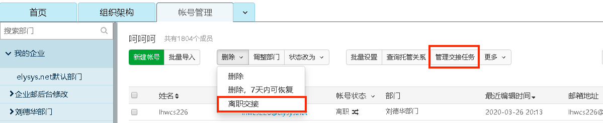 为避免“离职交接”功能被滥用,导致数据泄露,离职员工的邮件、通讯录仅支持成功交接一次;交接中的帐号不支持变更状态(正常、禁用、假删)。